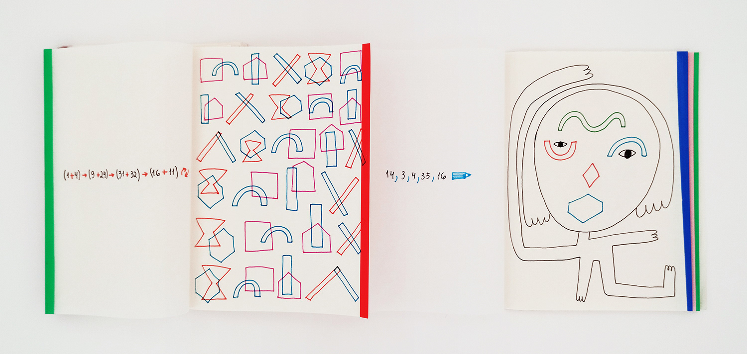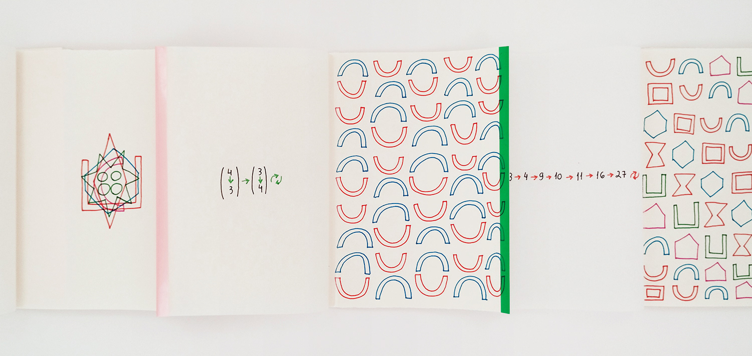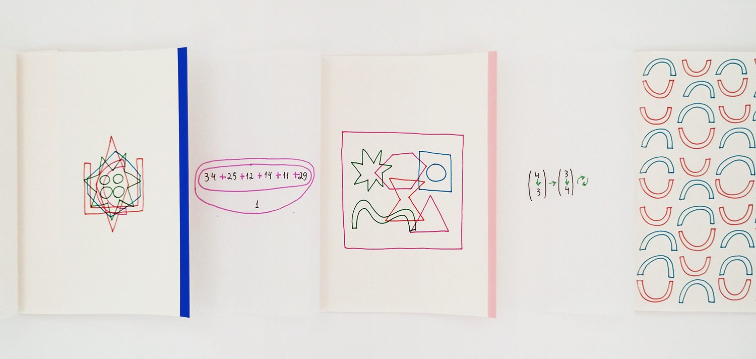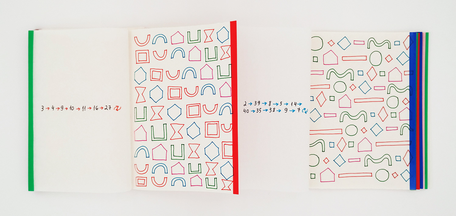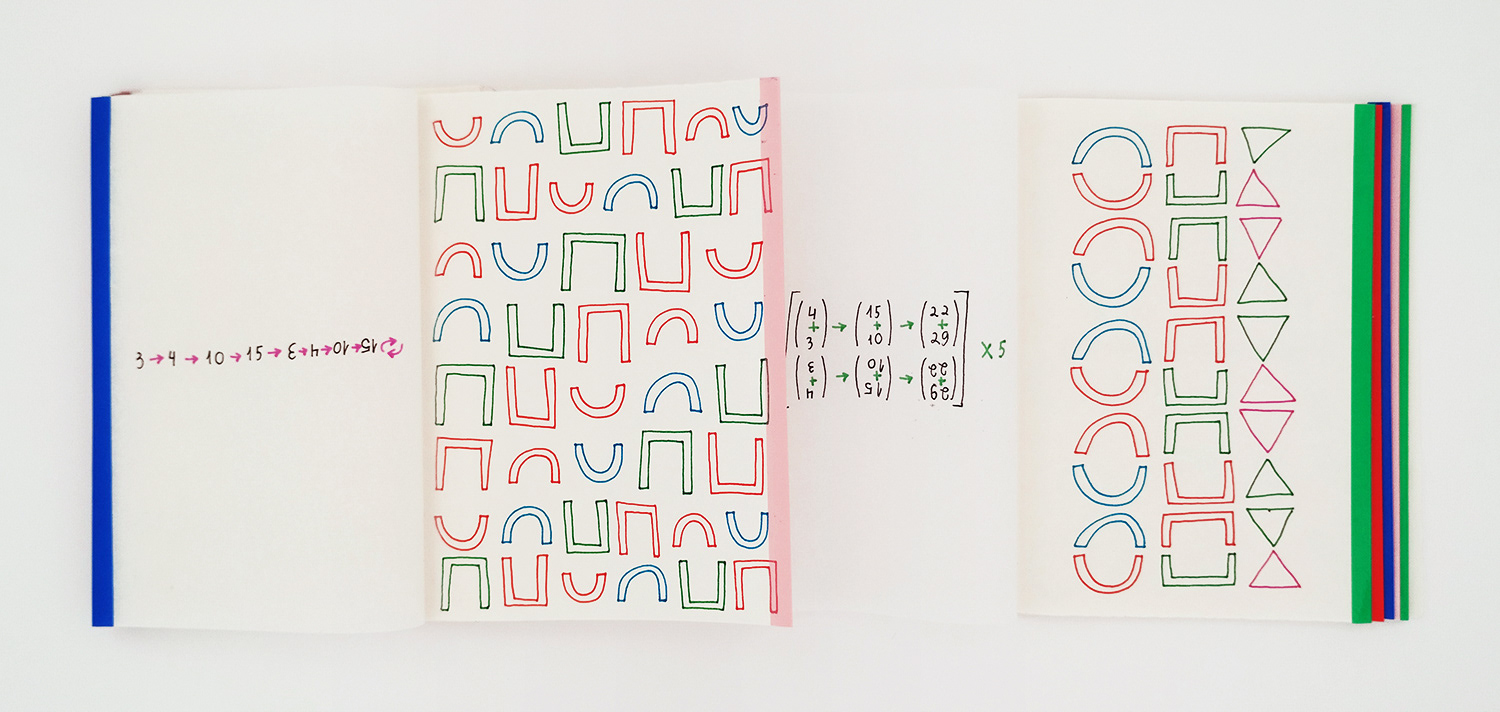Livro em formato sanfona com papel sulfite e papel manteiga, canetinha e fita adesiva. A ideia deste estudo foi criar os desenhos a partir do gabarito de formas da capa (primeira imagem) e pensar como os sinais (+, x, setinhas, etc) influenciam nestas instruções ou frases.