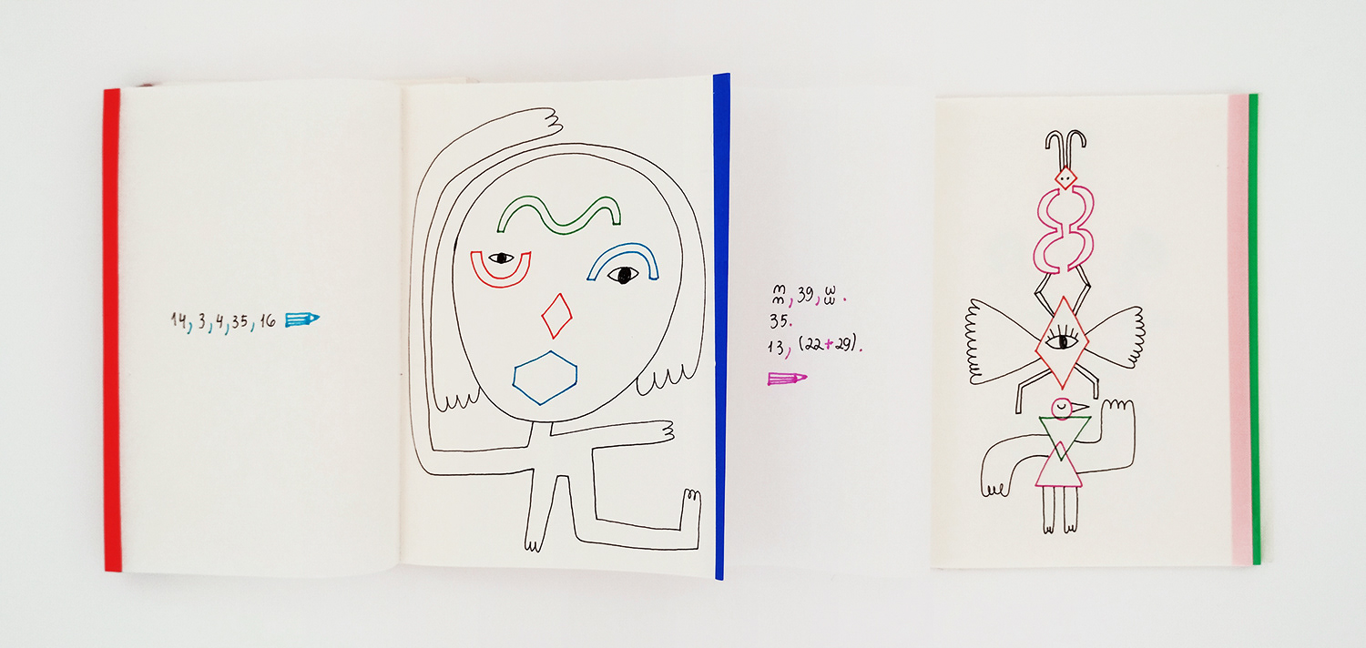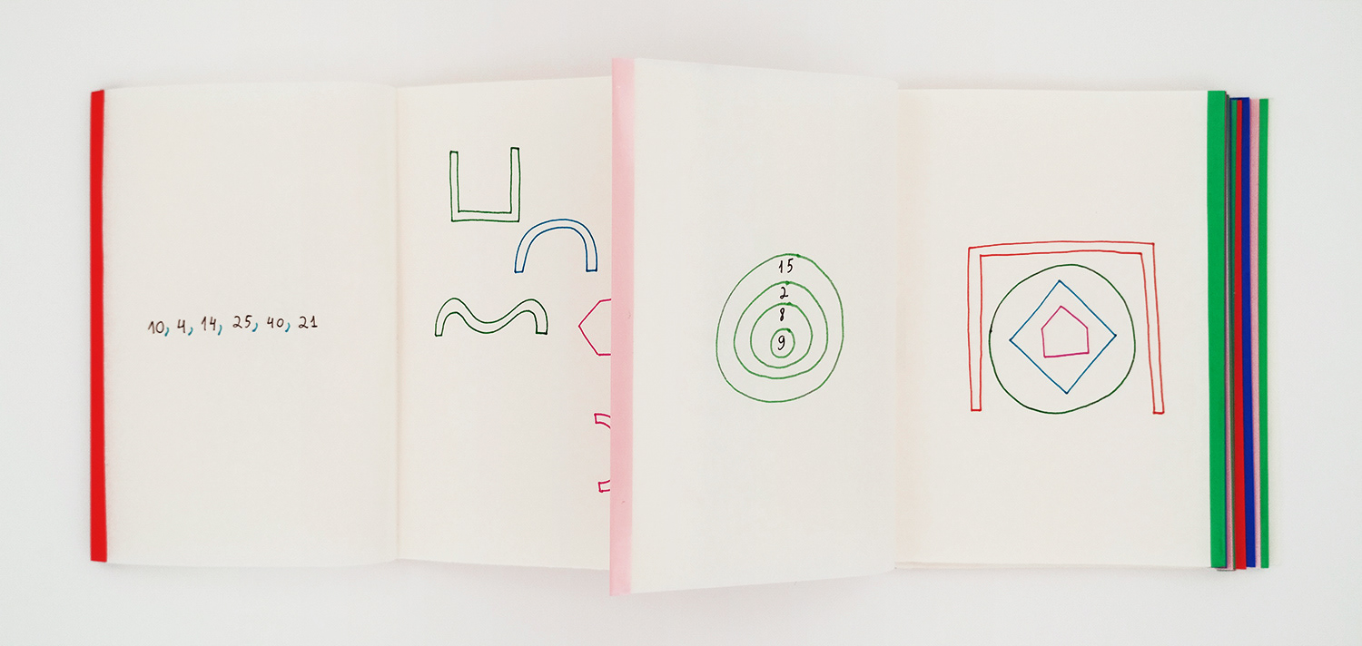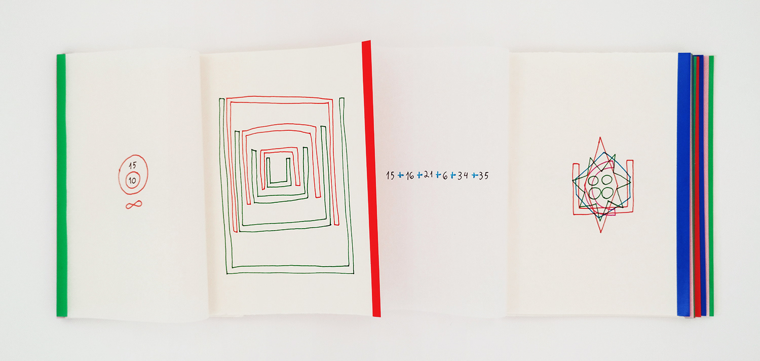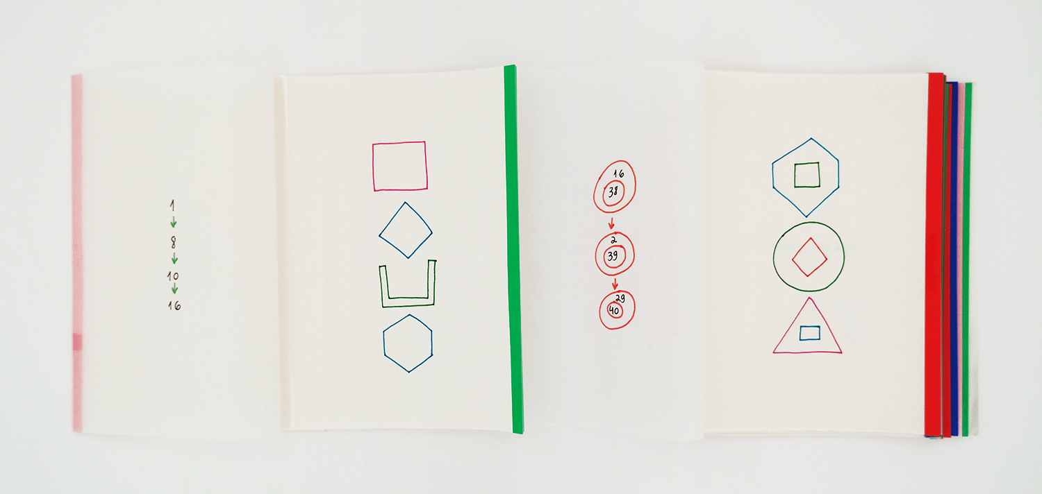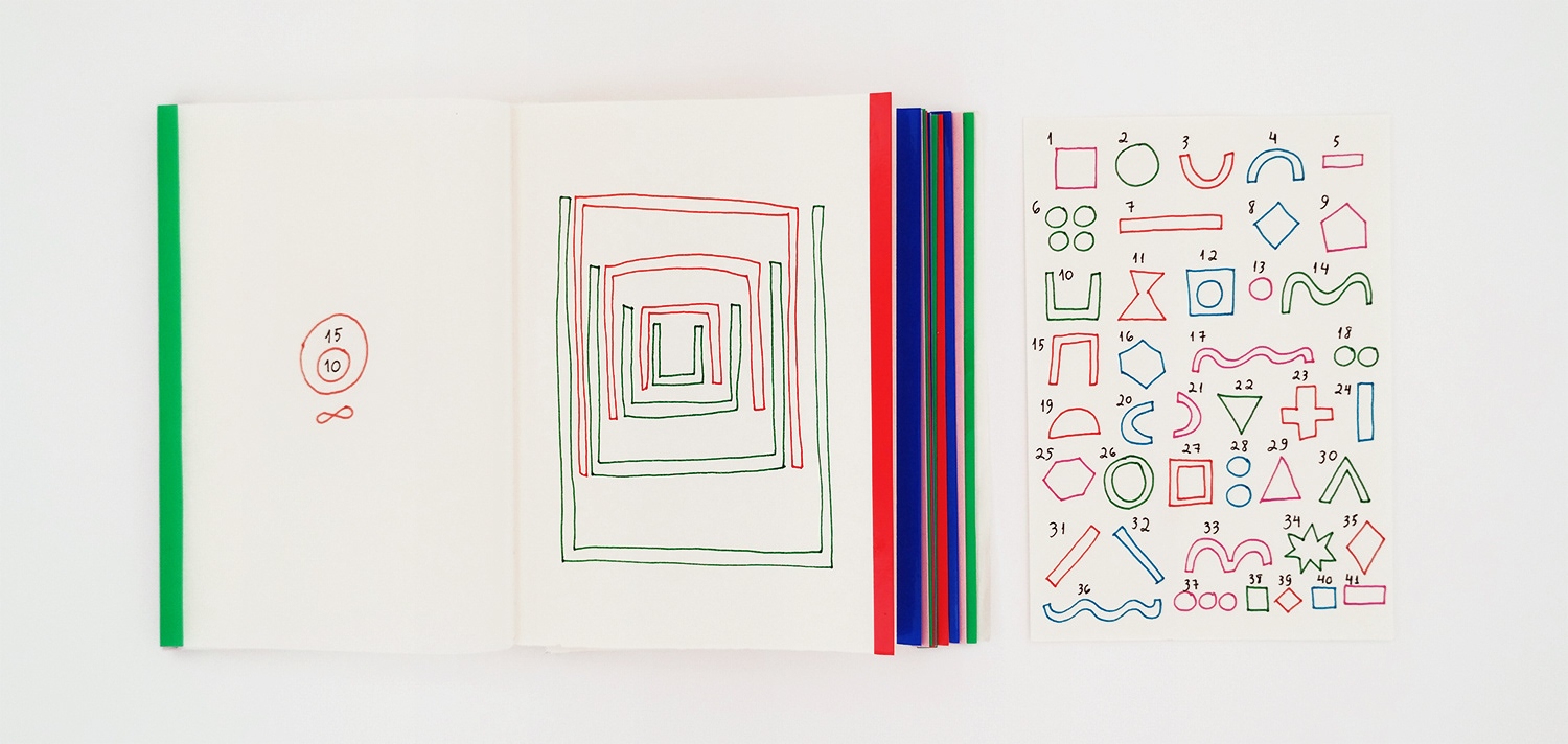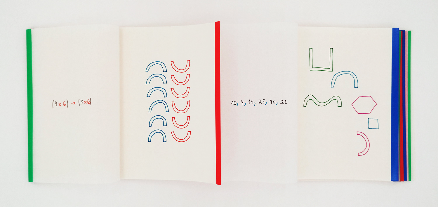 Livro em formato sanfona com papel sulfite e papel manteiga, canetinha e fita adesiva. A ideia deste estudo foi criar os desenhos a partir do gabarito de formas da capa (primeira imagem) e pensar como os sinais (+, x, setinhas, etc) influenciam nestas instruções ou frases.