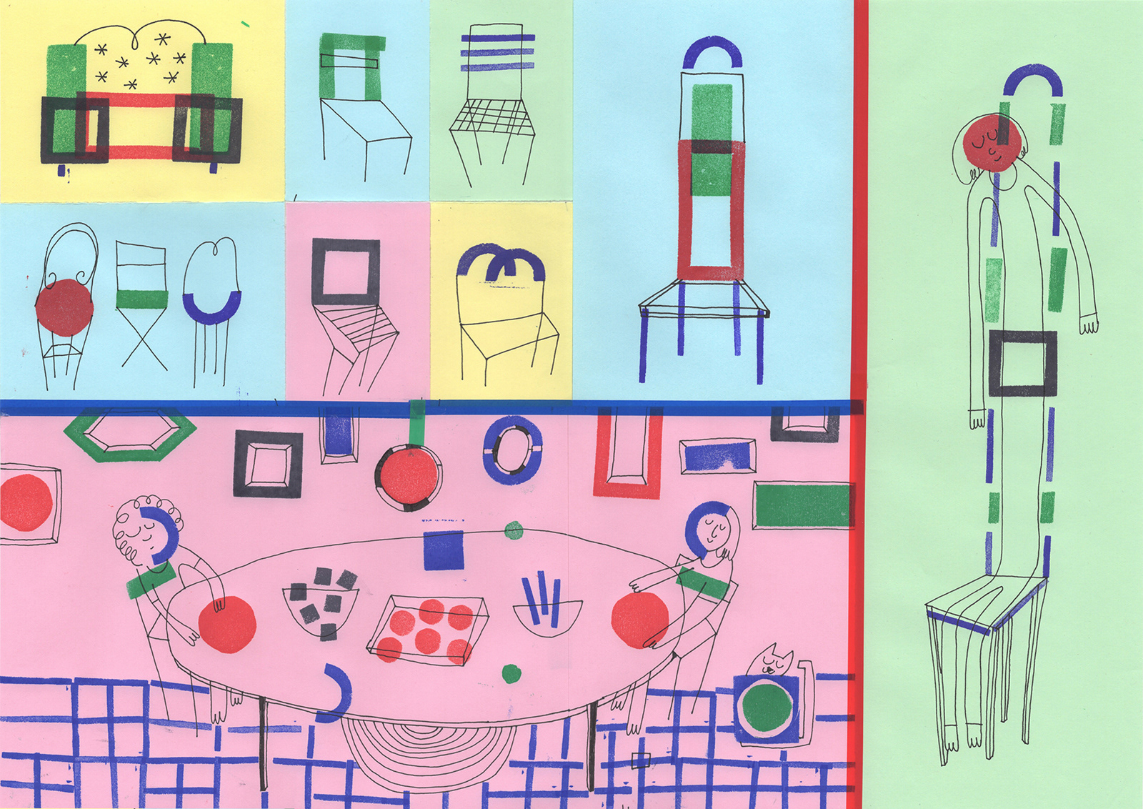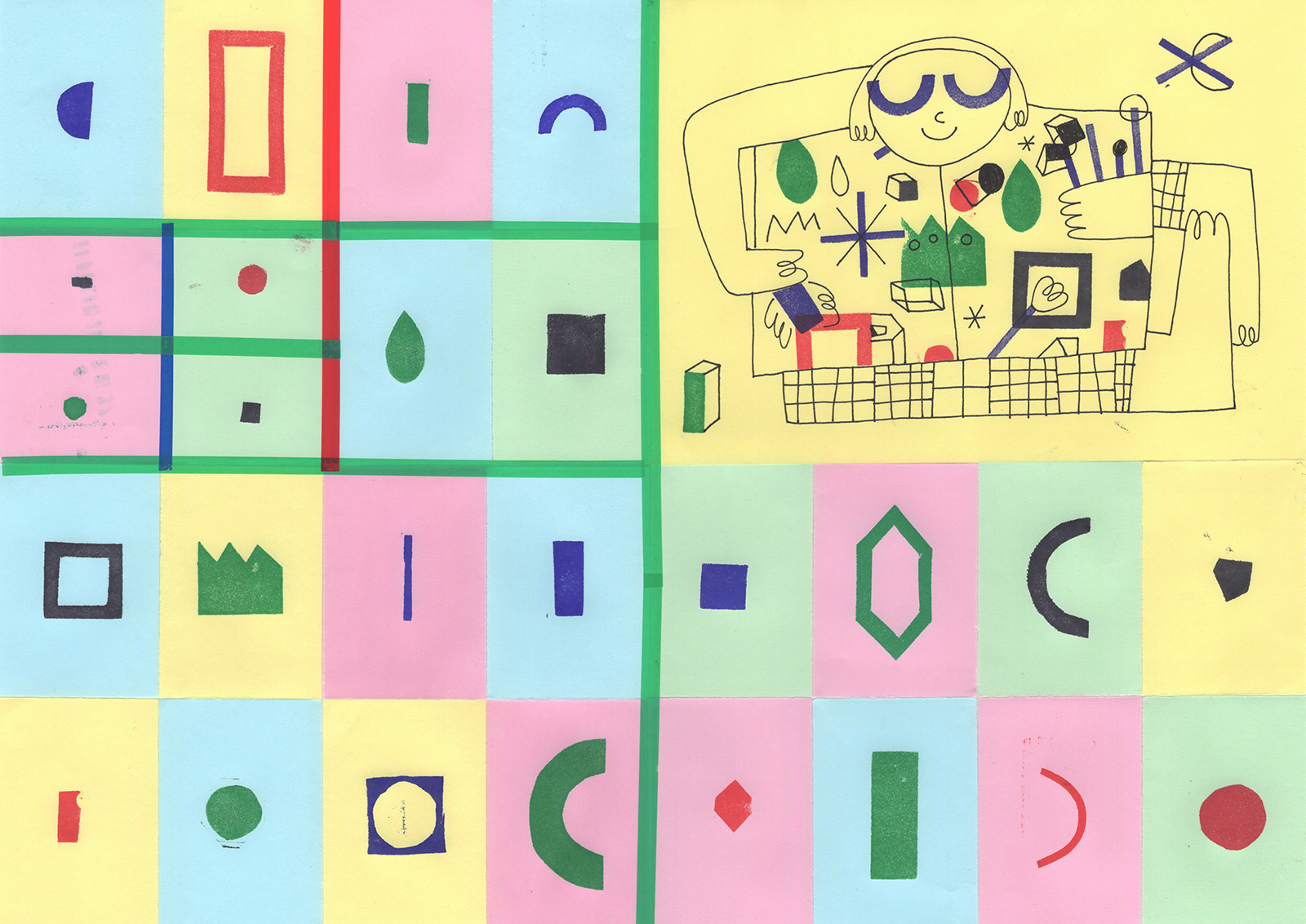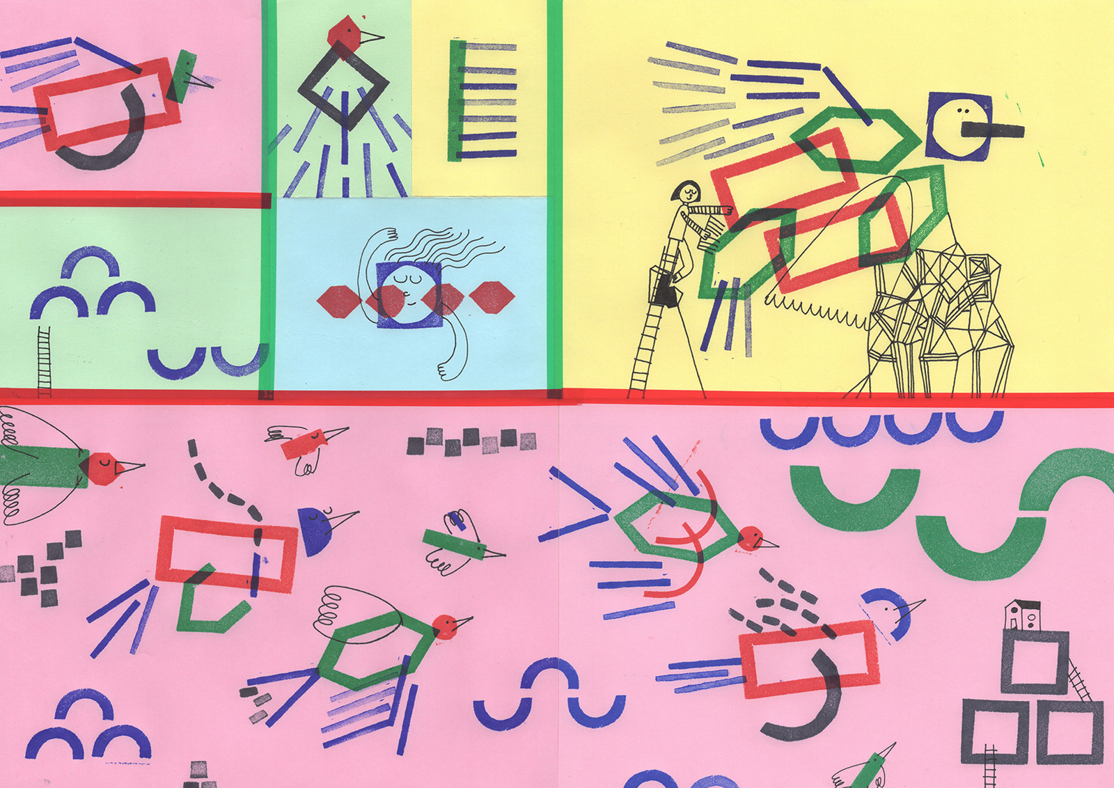 Série de 5 ilustrações com papel colorido, fita adesiva, carimbo e caneta preta. Essa série foi selecionada na primeira etapa do concurso da Exposição de Ilustradores da Feira do Livro Infantil de Bolonha em 2021.